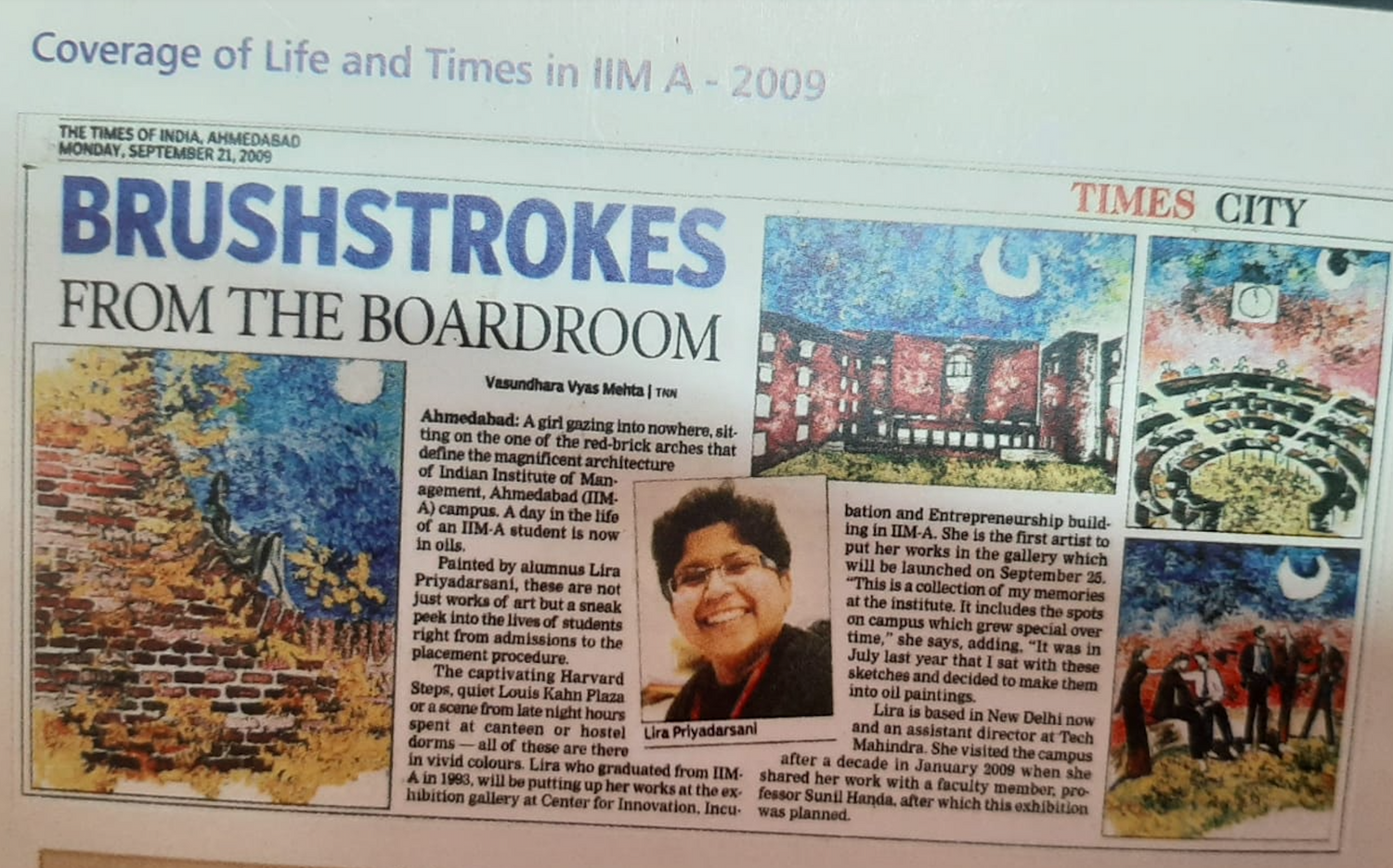 Lira has been studying and painting, working and painting. Even through her stressful MBA in IIM Ahmedabad. She had a solo exhibition in 2009 of paintings about life and time in IIM Ahmedabad.
